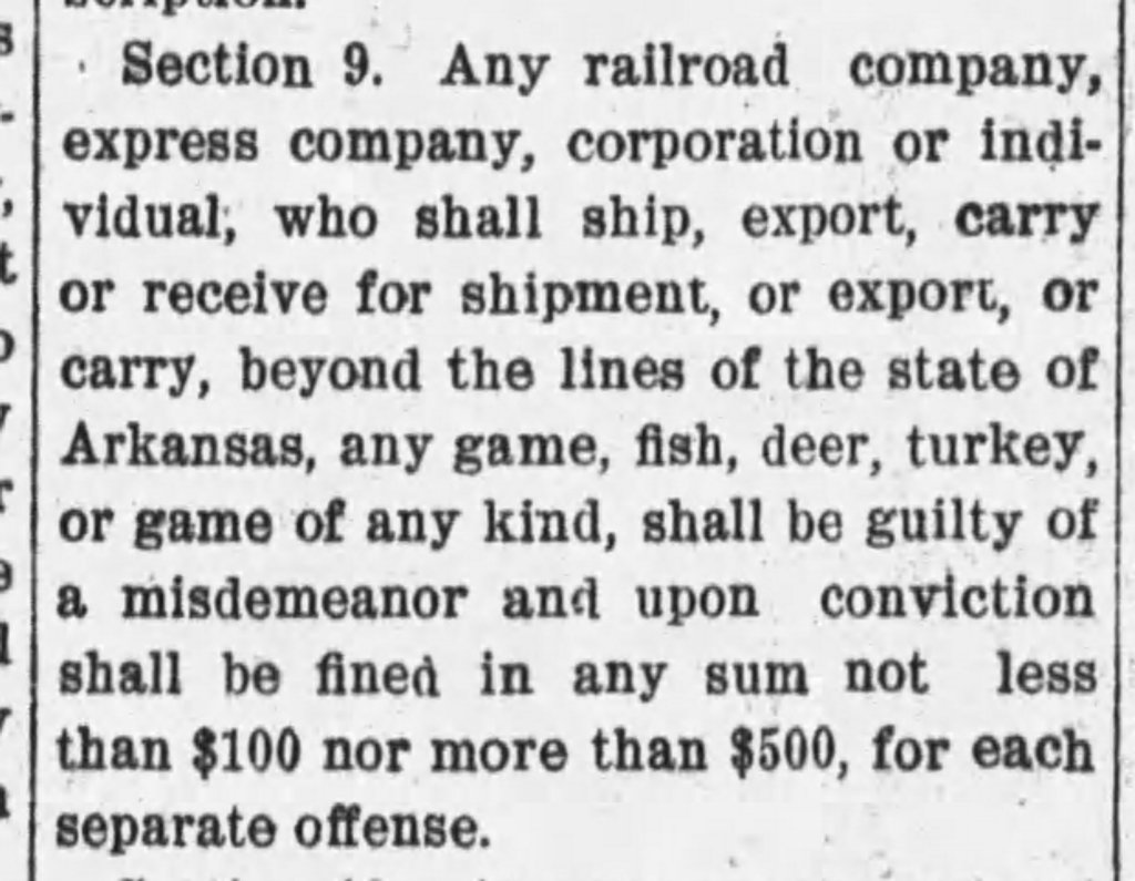 Today is a follow-up from yesterday and the DeRossitt Bill. This is the bill that barred railroad and express companies from shipping game from the state, a move that angered many non-residents who owned land in Arkansas and hunted there. They wanted to be able to ship their harvests back home. However, the ban was designed to stop market hunting in Arkansas, where employed men slaughtered thousands of animals and shipped them to meat markets outside of the state. Companies convicted of violating this ban received a $100 to $500 fine, quite the sum in 1903.