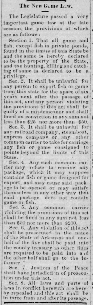 In 1889, the Arkansas Legislature passed a few game laws. One of them provided the foundation for many game laws that followed. They declared that Arkansas owned the game and fish, except the fish in private ponds. On that premise, Arkansas lawmakers have made the remaining Arkansas wildlife laws. Secondly, they passed a law, aimed at market hunting, that said no person could ship game and fish out of Arkansas. This was an excellent law. The bad thing about it was, within the year, Mississippi County had exempted itself from the law. That made the law worthless because anyone, anywhere in Arkansas could first ship their game and fish to Mississippi County and then out of the state from there. #arkansaslaw #arkansas #arkansaswildlife #arkansasoutdoors #arkansasgameandfish #arkansasvintage #vintagewildlife #hunting #fishing #vintagehunting