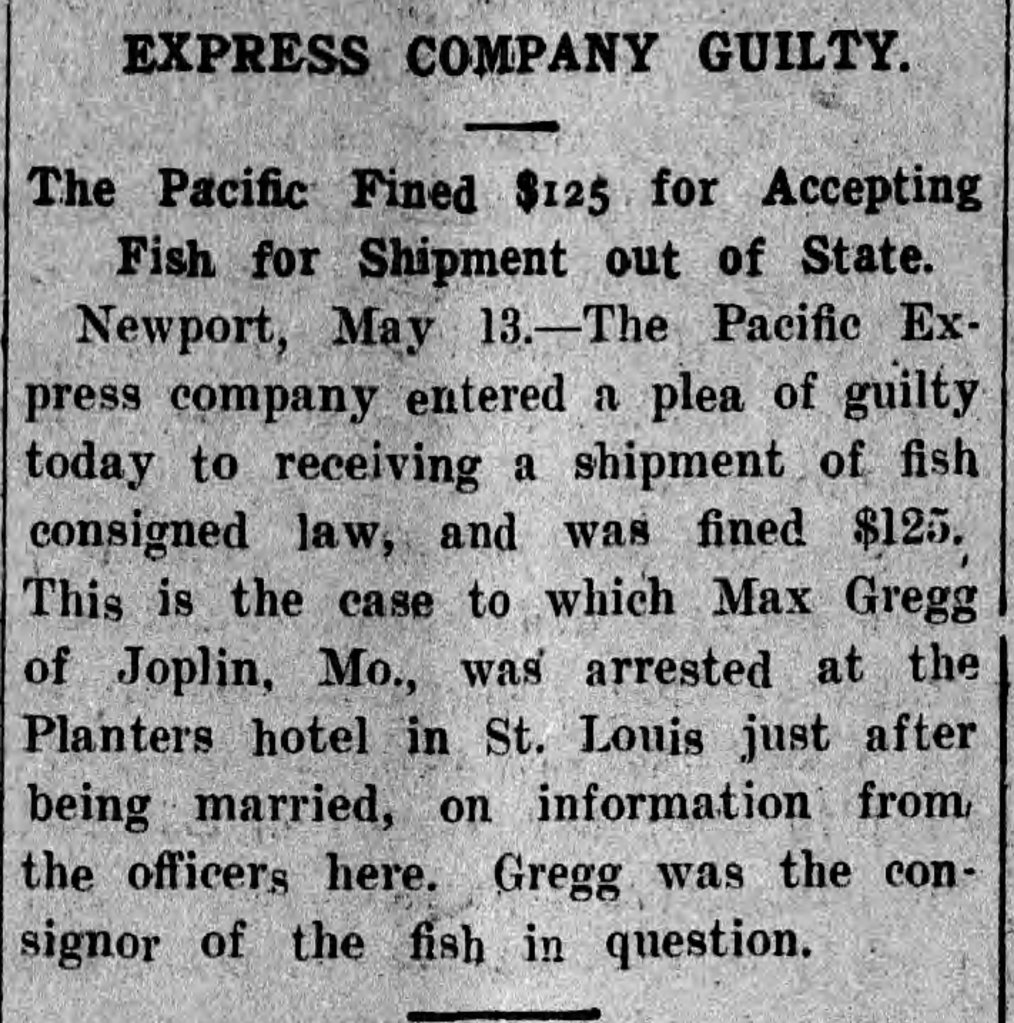 On May 13, 1907, a Fort Smith newspaper reported that a shipping company received a fine for shipping fish illegally out of Arkansas to St. Louis. Authorities arrested the fellow who had shipped the fish from an Arkansas fishing trip to his hometown of St. Louis… just after his wedding.