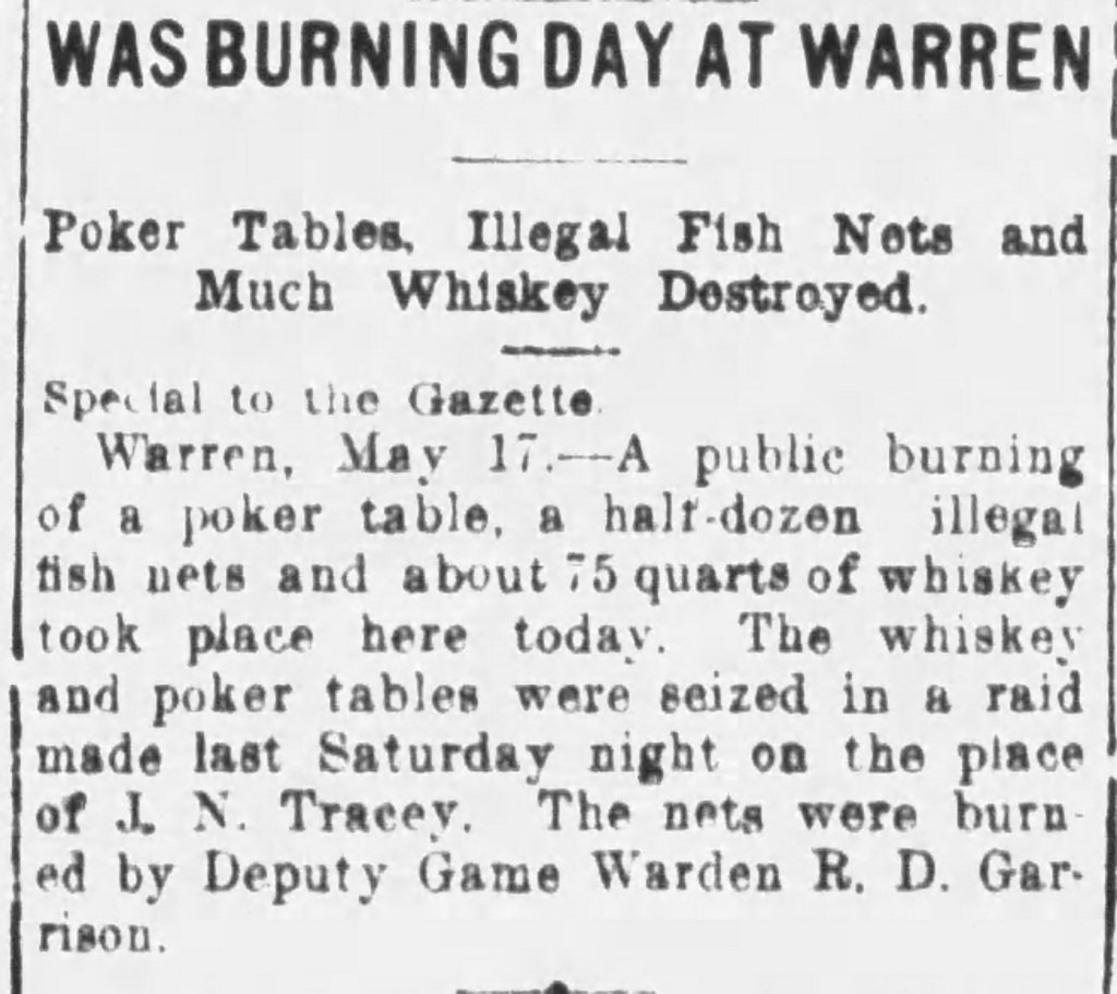 Sometimes poachers moonshined and moonshiners poached. In many cases, people who broke game and fish laws also broke other laws. After prohibition, several illegal liquor smugglers used the same routes to smuggle game and fish. In 1910, authorities broke up raided Warren resident J. N. Tracey’s place, and found gambling tables, liquor, and banned fishing nets.