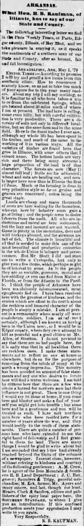 Illinois Representative R. B. Kauffman visited Arkansas in 1879 on a visit. He felt compelled to write a letter to his local newspaper describing what he experienced during the trip. Besides claiming that Arkansas had received an undeserved reputation, he said the land was good and cheaply acquired, wildlife filled the woods, and the waterways brimmed with fish.