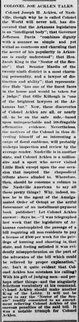 Colonel Joseph Acklen, millionaire lawyer, and sportsman from Nashville hunted Arkansas several times and developed the Big Lake Shooting Club near Manila in northeastern Arkansas. He was an enemy of the market and pot hunter. The former Tennessee State Game Warden lobbied in Little Rock several times to end market hunting in Arkansas but fought to maintain the ability for non-residents to hunt in the Bear State. Several Arkansawyers loathed Acklen and his meddling in Arkansas affairs, especially those of the poorer class. In this newspaper article, we see an Arkansas newspaperman level his sights on Acklen over his fight against a bill that called for non-residents to pay $500 per week to hunt in Arkansas.