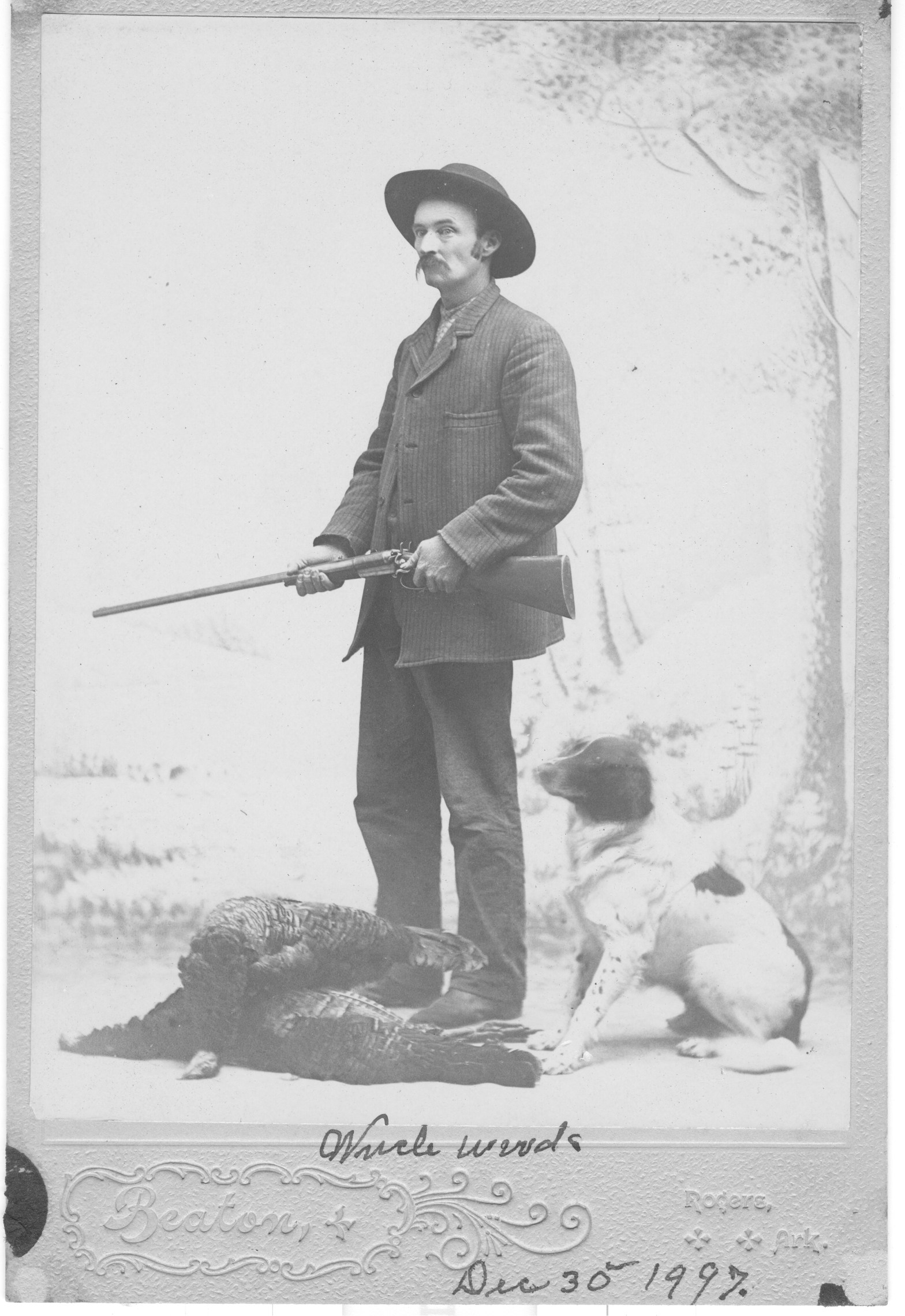 Woods Stroud, a farmer from Rogers, with two wild turkeys and his dog at Beaton Photography Studio in 1897. Stroud was born in 1858, three years before the outbreak of the American Civil War. He died in 1833.