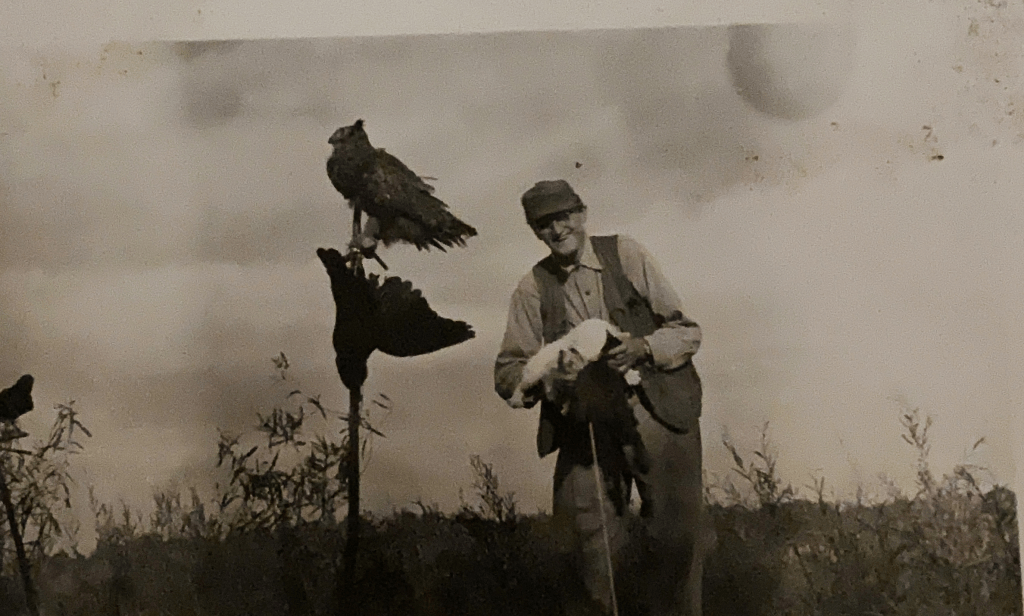 1942 Pine Bluff Resident Robert (Gillam) Lawton (b. SEP 23, 1877) is seen after a field hunt with his crow hunting set up, complete with a stuffed owl, crow decoy, and one alley cat (in his hands along with a dead crow). He sure does seem like he is enjoying himself.