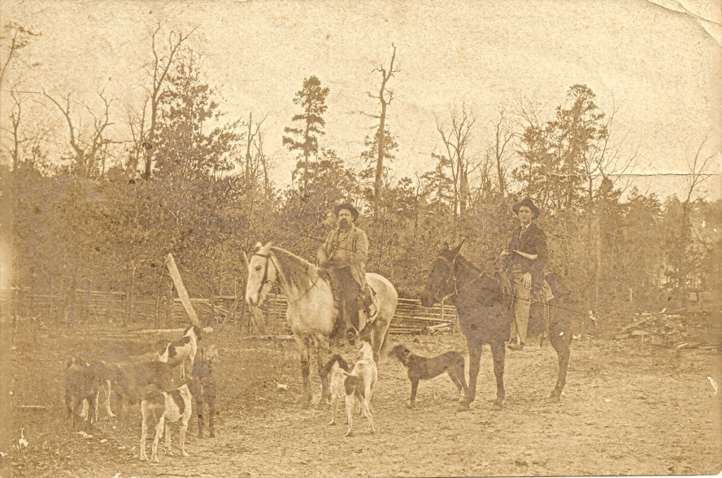 Circa 1905, Elon H. Fielder (b. 23 AUG 1853) is on a white horse with a powder horn. His son, Claud R. Fielder (b. 13 JAN 1882), has a hunting horn around his neck (used to call the dogs). They have a pack of hounds. The pair are about to head off on a deer hunt in Dallas County, Arkansas. Notice the split rail fence in the background.
