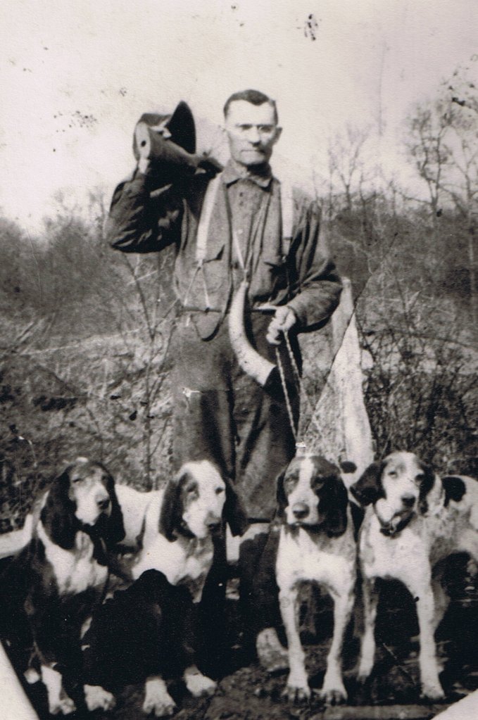 Circa 1930, in Chicot County, Arkansas. Albert Lewis Morse was born on Christmas Day, 1872. He has brought together a great set of hunting hounds. His horn is around his neck on a string, and his long gun is propped on his shoulder. Morse took off his hat for the photograph. It is difficult to tell, but it seems that he is barefooted.