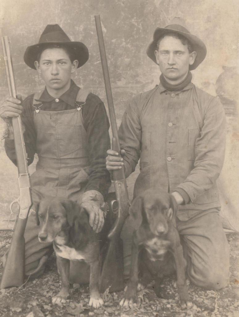 Probably taken in Polk County around 1910-1920. Colonel J. Standridge (name not title) was born on November 26, 1891, in Montgomery County, Arkansas (on the right with the work coat and slouch hat), and Jesse James Beck (July 21, 1897) poses on the left with the overalls. They were cousins. They have a pair of fine hunting dogs and are well-armed with a single-shot shotgun and a nice lever action rifle. JJ wears a nice pair of gloves with a star on the wrist. Standridge served during World War I as a private. In the 1920 US Census, they are boarders in the home of Tom & Faydeta Spake in Big Fork, Polk County, and work at the sawmill. Image Source: Ancestry.com.