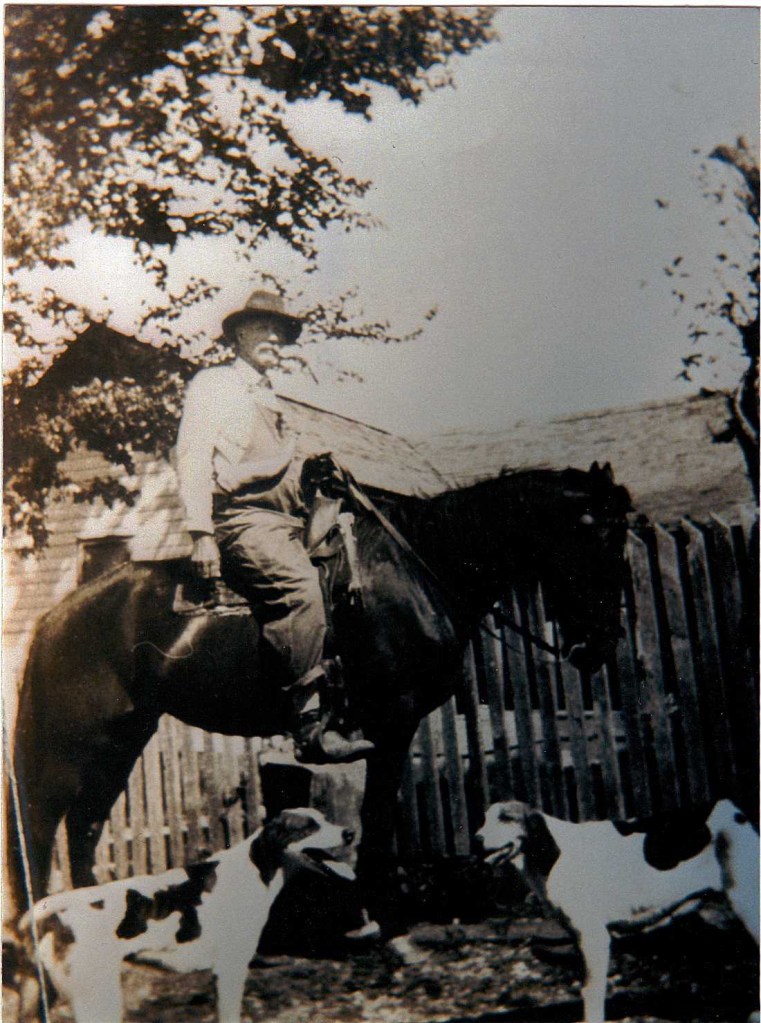 This photo was taken in the 1930s, somewhere in North Arkansas. William H. Hammons (May 8, 1854- November 23, 1941) on horseback with hunting dogs. He was born in Kentucky. In 1910, he lived in Washington, Arkansas. By 1920, he was in Madison County, Arkansas, and lived there until he died in 1941.