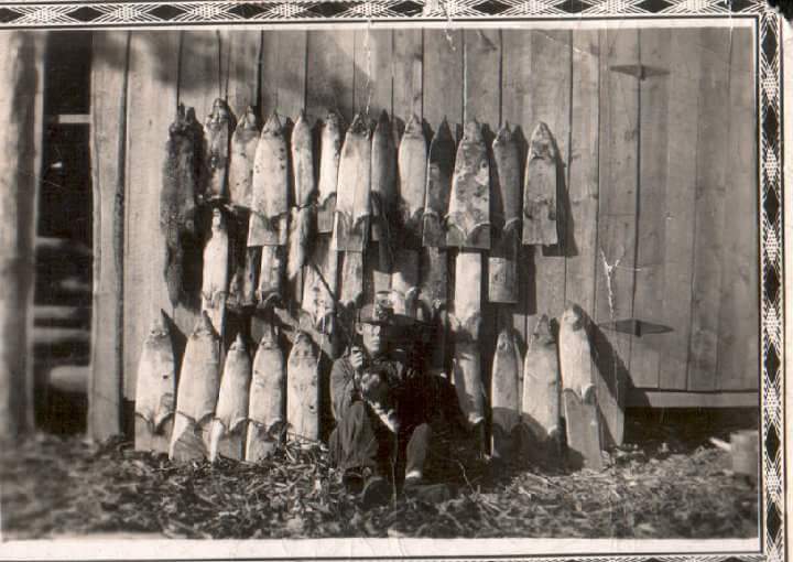White County Trapper Clarence Haer (pronounced HARE) (August 17, 1901-March 17, 1963) in the 1930s with several pelts. Haer has a rifle, his dog, and a carbide lamp. In 1930, he was listed as a farmer living with his wife, Dovie, and four children (Laurine, Ralph, Juanita, and Carlos).