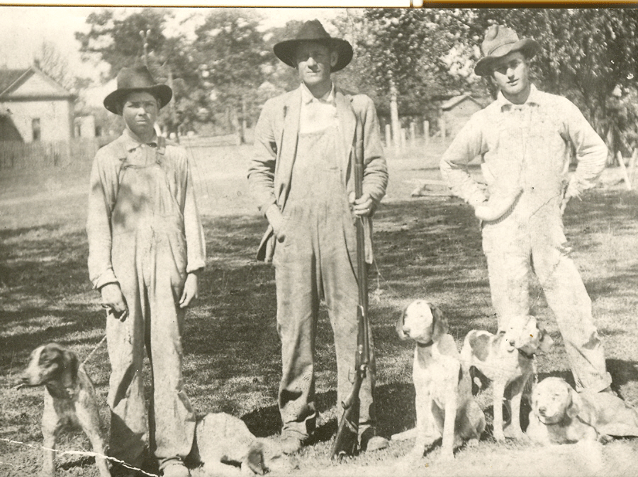 1918 Columbia County, Arkansas. From left to right Roy McMahen, Dee McLaughlin and Robert Rogers (b. 17 Oct 1899) and their hunting dogs.